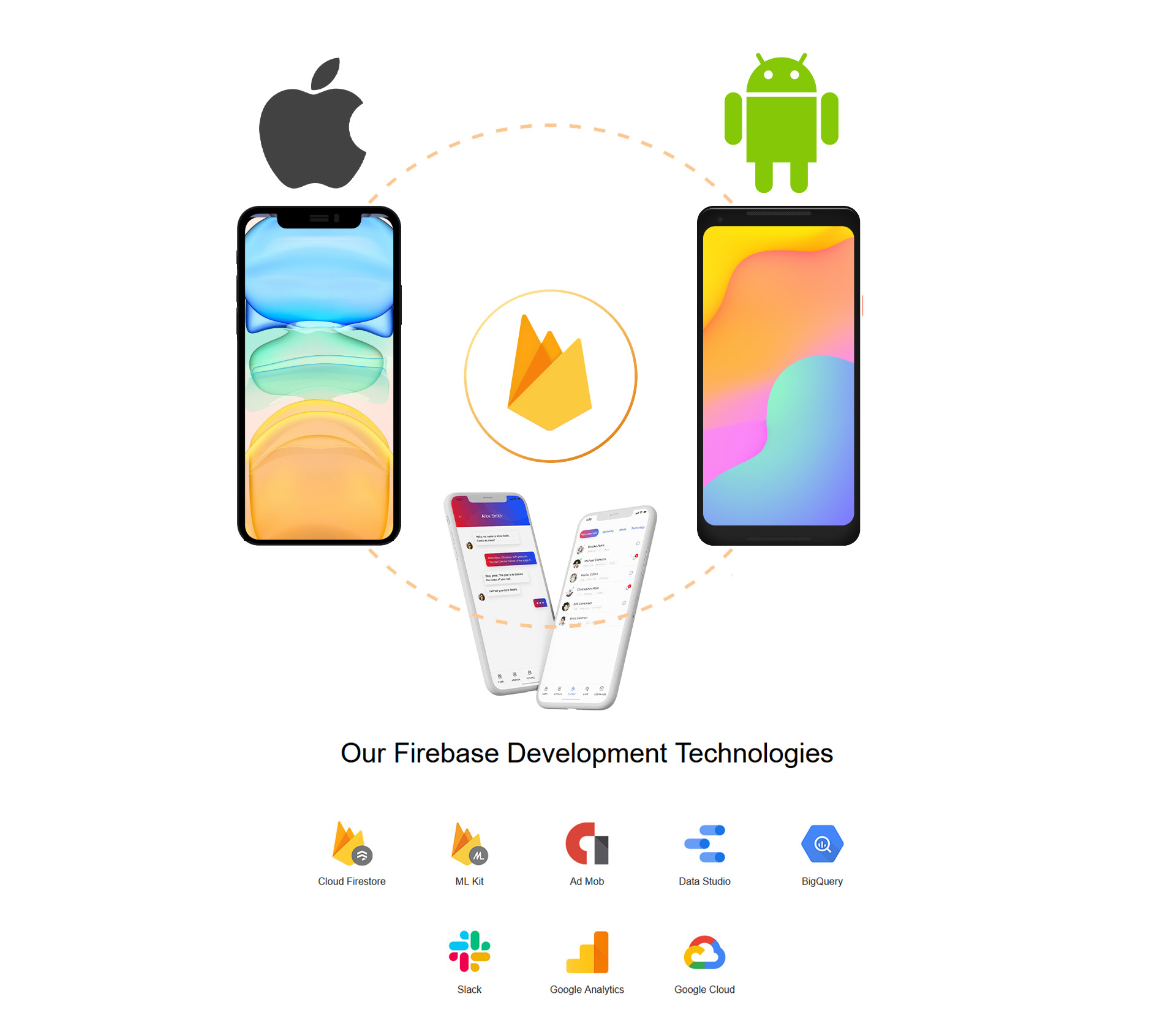Our expert Firebase developers deliver faster and scalable Android, iOS, web apps with high performing back-end systems. Using the best of Firebase features like sync and data storage in milliseconds, we build real-time back-end web and mobile apps and develop custom chat solutions to meet your business’ needs. Enlist Firebase for web development and mobile app development by Google to add lucidity and effortlessness to product development, improvement, integration, bug-fixes and discharge measures while adding to app promoting, user engagement and user experience.